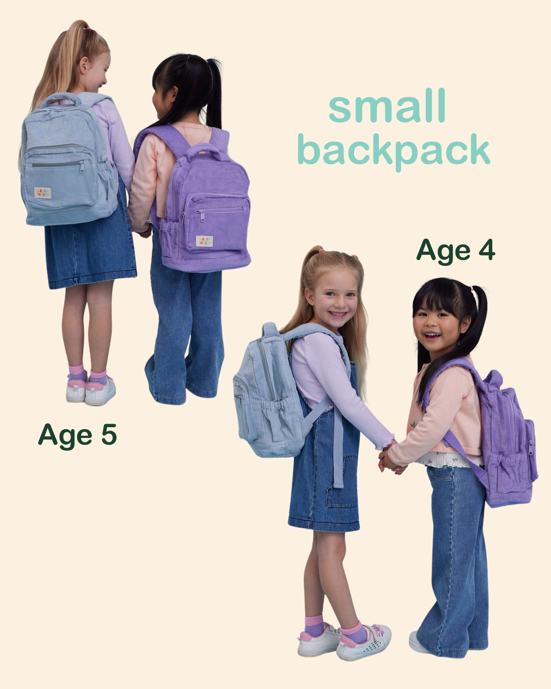 Both sizes feature the same durable construction made from soft 100% cotton corduroy, a water-resistant inner lining, durable zippers, and kid-friendly hardware. No matter the size you choose, these backpacks are built to withstand the most exciting of little expeditions while keeping everything safe and sound.